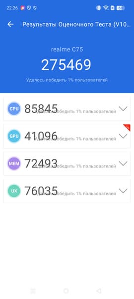 Смартфон Realme C75 получил батарею с объемом 5828 мА·ч, в тестах он демонстрирует довольно высокий уровень автономности.
