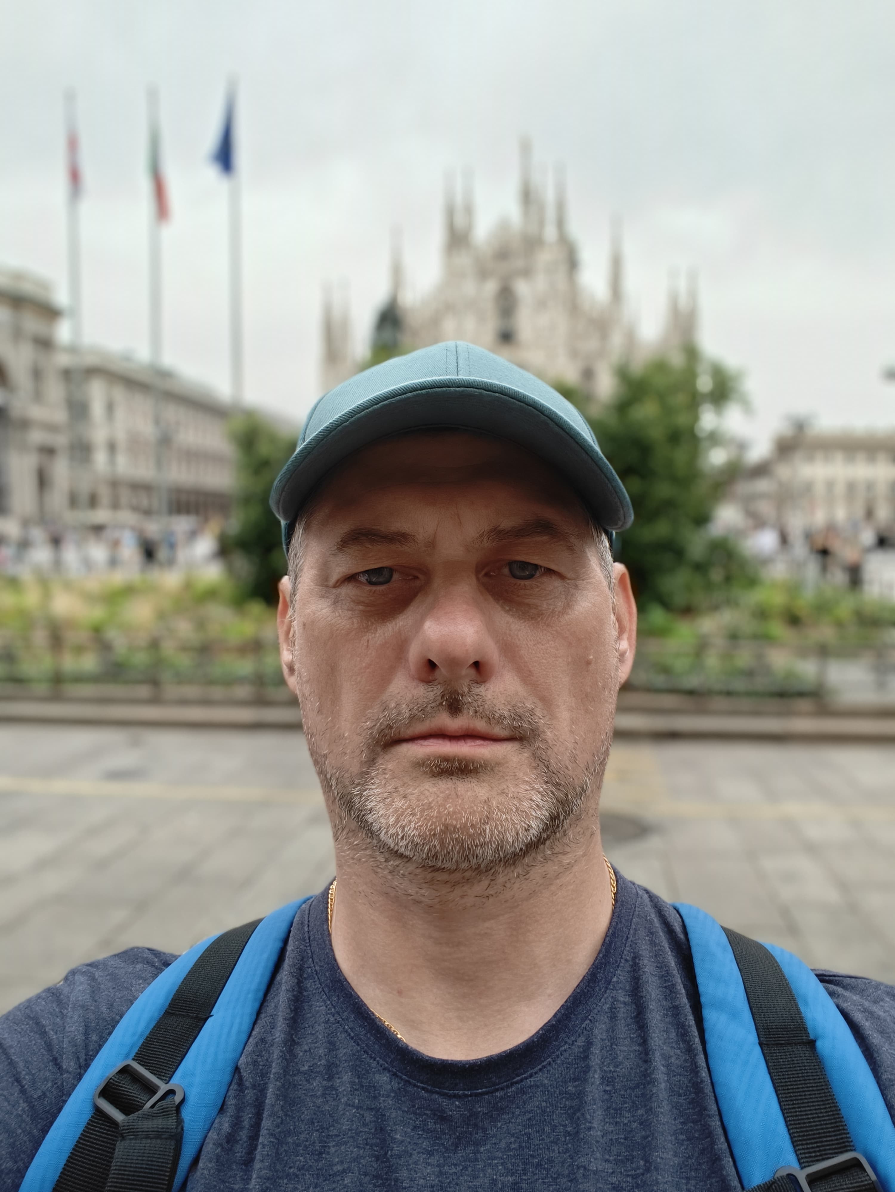 Фронтальная камера (32 Мп, Sony IMX615, f/2,45) снимает на высший балл. Полная проработка всего диапазона светов, никаких завалов в тенях, высочайшая детализация, отличные четкость с резкостью. И даже нет искажений цветопередачи. Портретный режим почти идеально отделяет объект от фона.