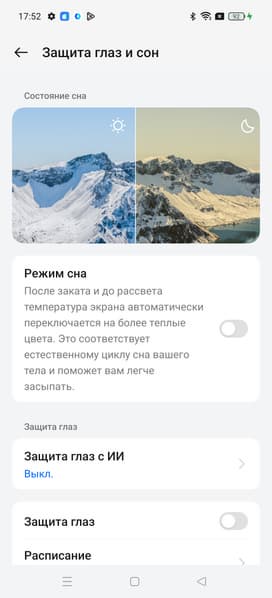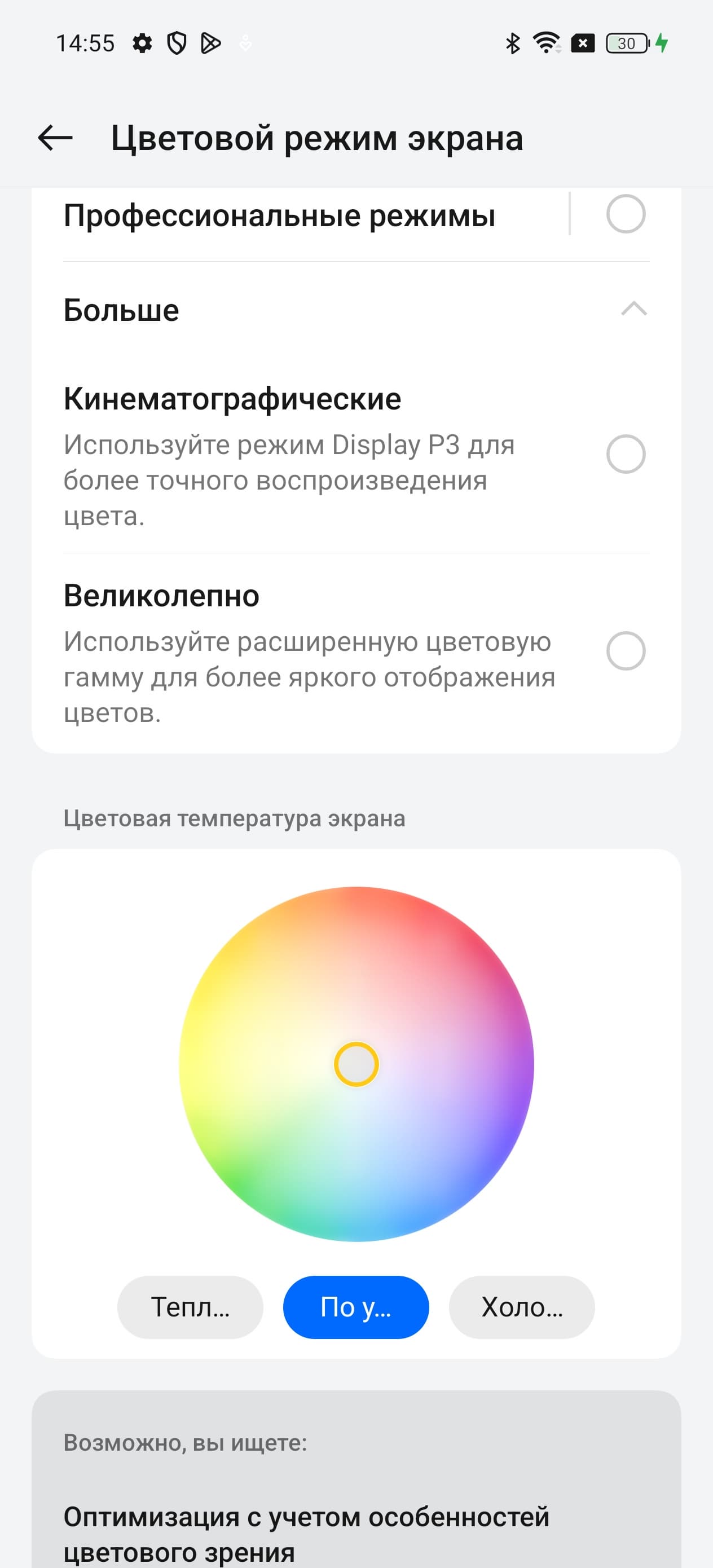 Дополнительно в этом устройстве есть возможность скорректировать цветовой баланс с помощью выбора профиля цветовой температуры или регулировки оттенка на цветовом круге. Но особого смысла это делать нет, достаточно выбрать профиль Естественный. Также в настройках можно уменьшить интенсивность синей компоненты.
