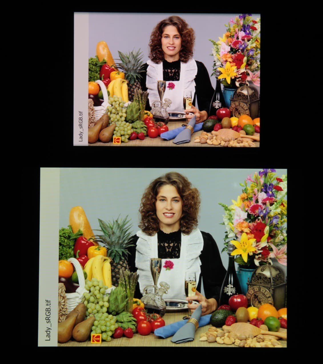 Отметим, что на экранах с широким цветовым охватом без соответствующей коррекции цвета обычных изображений, оптимизированных для устройств sRGB, выглядят неестественно насыщенными. Отсюда и рекомендация: в большинстве случаев смотреть кино, фотографии и все естественное лучше при выборе профиля Естественный. Профиль Яркие цвета (или Кинематографические) уместен при просмотре материала с охватом DCI-P3, принятым в цифровом кинематографе, но в быту встречающимся редко.