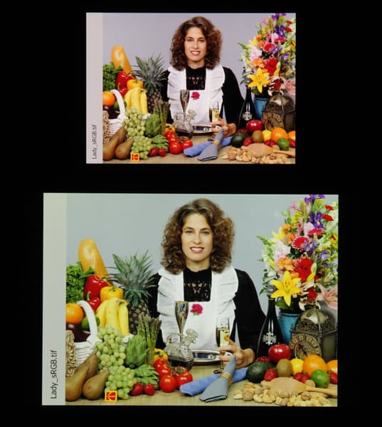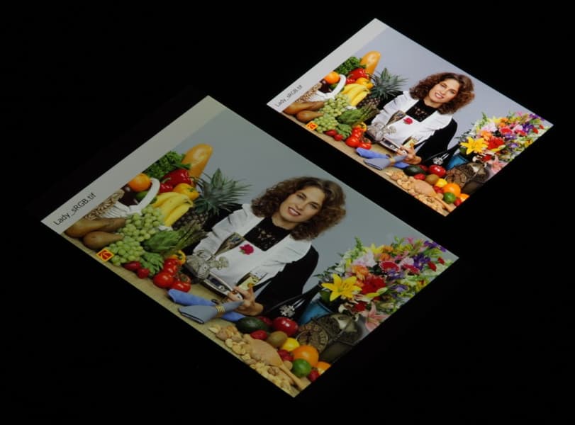 Цвета на экране Realme GT Master Edition перенасыщены (обратите внимание на помидоры, бананы, салфетку и оттенок лица), а цветовой баланс заметно отличается. Напомним, что фотография не может служить надежным источником сведений о качестве цветопередачи и приводится только для условной наглядной иллюстрации. В частности, выраженный красноватый оттенок белого и серого полей, присутствующий на фотографиях экрана Realme GT Master Edition, при перпендикулярном взгляде визуально отсутствует, что подтверждается аппаратными тестами с помощью спектрофотометра. Причина в том, что спектральная чувствительность матрицы фотоаппарата неточно совпадает с этой характеристикой человеческого зрения.