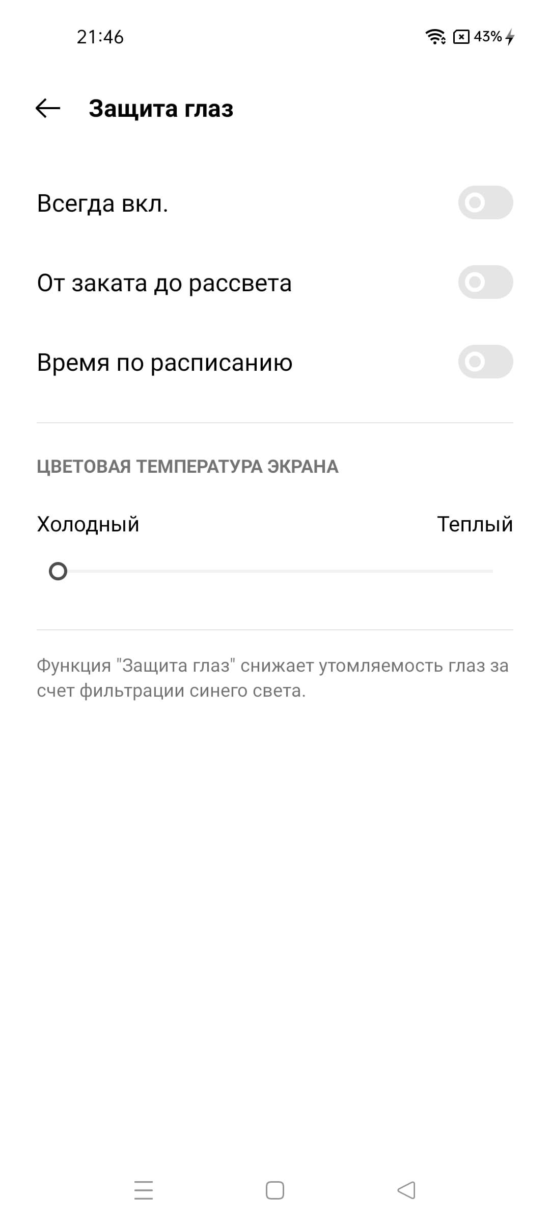 В этом устройстве есть возможность скорректировать цветовой баланс с помощью регулировки оттенка холодный—теплый. Но особого смысла это делать нет, достаточно выбрать профиль Нежность. Также в настройках можно уменьшить интенсивность синей компоненты: