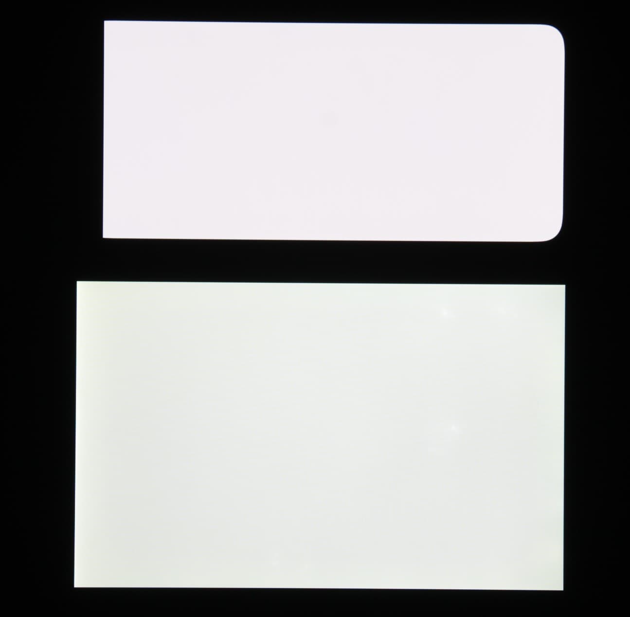 Экран характеризуется великолепными углами обзора. Правда, белый цвет при отклонении даже на небольшие углы приобретает легкий сине-зеленый или розоватый оттенок, но черный цвет остается просто черным под любыми углами. Он настолько черный, что параметр контрастности в данном случае неприменим. Для сравнения приведем фотографии, на которых на экраны Realme GT Master Edition и Nexus 7 выведены одинаковые изображения, при этом яркость экранов изначально установлена примерно на 200 кд/м², а цветовой баланс на фотоаппарате принудительно переключен на 6500 К.