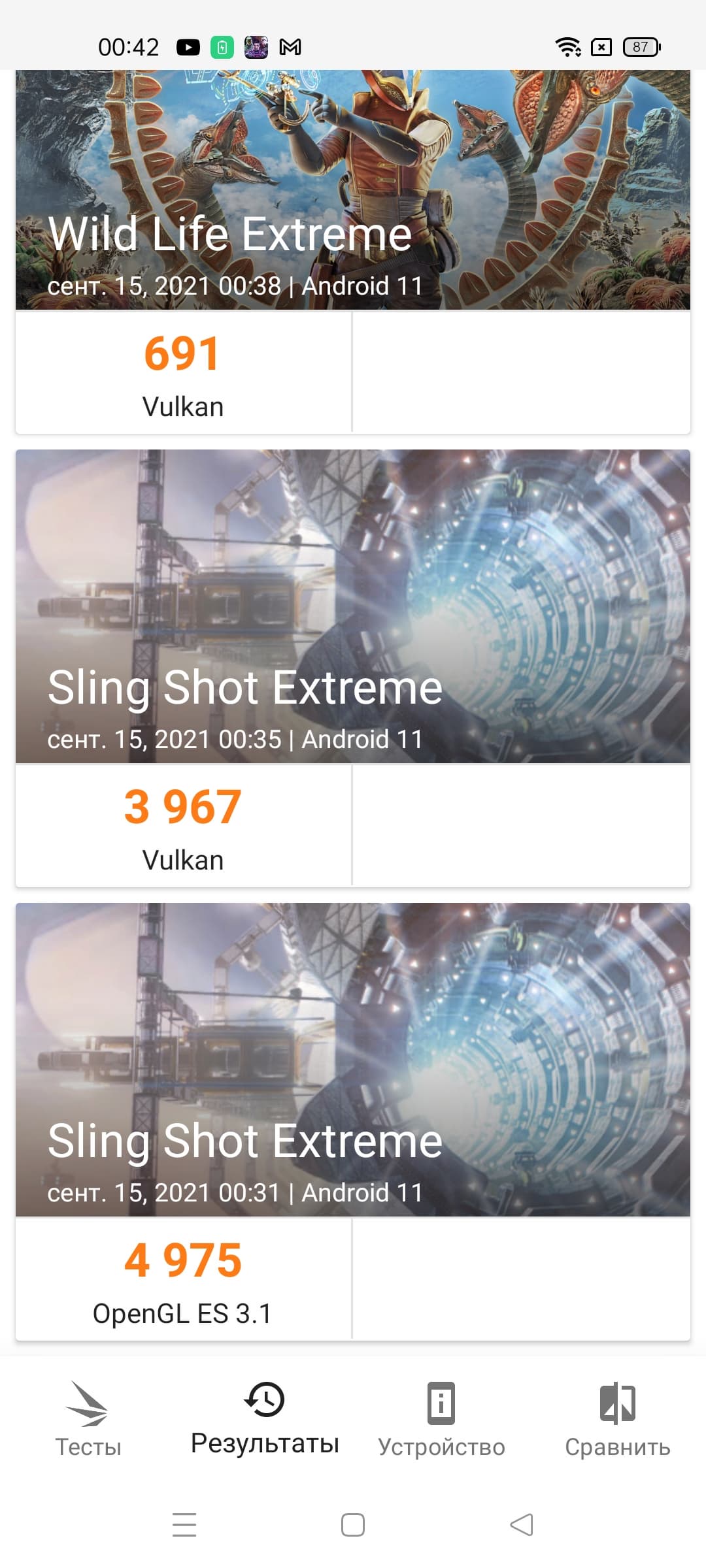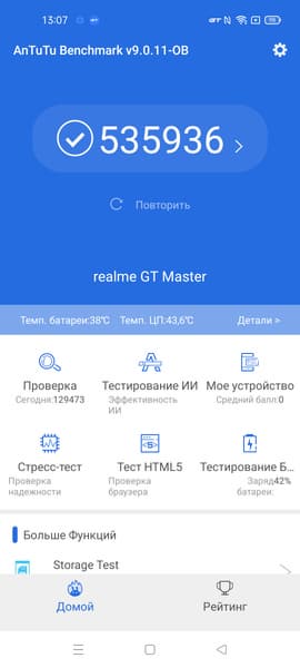 Realme GT Master Edition на субфлагманской SoC Snapdragon 700-й серии, произведенной по техпроцессу 6 нм, демонстрирует достойные результаты в синтетических тестах и не страдает от недостатка производительности в реальной эксплуатации. Платформа совсем свежая и очень добротная, ее возможностей хватает для плавной работы интерфейса, быстрого открытия любых приложений и возможности играть в любые, даже требовательные игры на средних и высоких настройках графики. С самыми требовательными играми (Call of Duty Mobile, Injustice 2) аппарат справляется без притормаживаний.