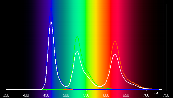Цвета на экране Realme GT Neo 2 перенасыщены (обратите внимание на помидоры, бананы, салфетку и оттенок лица), а цветовой баланс заметно отличается. Напомним, что фотография не может служить надежным источником сведений о качестве цветопередачи и приводится только для условной наглядной иллюстрации. В частности, выраженный красноватый оттенок белого и серого полей, присутствующий на фотографиях экрана Realme GT Neo 2, при перпендикулярном взгляде визуально отсутствует, что подтверждается аппаратными тестами с помощью спектрофотометра. Причина в том, что спектральная чувствительность матрицы фотоаппарата неточно совпадает с этой характеристикой человеческого зрения.
