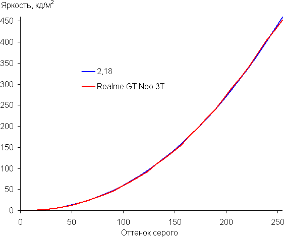 Напомним, что в случае OLED-экранов яркость фрагментов изображения динамично меняется в соответствии с характером выводимого изображения — немного уменьшается для светлых в целом изображений. В итоге полученная зависимость яркости от оттенка (гамма-кривая), скорее всего, не точно соответствует гамма-кривой статичного изображения, так как измерения проводились при последовательном выводе оттенков серого почти на весь экран.