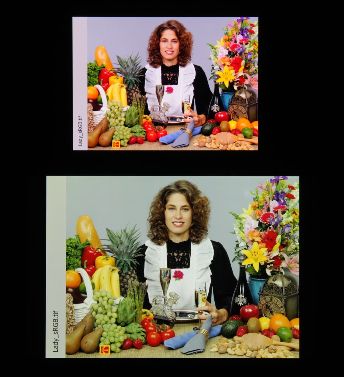 Цветовой охват в режимах Яркие цвета и Кинематографические шире sRGB и практически равен DCI-P3: