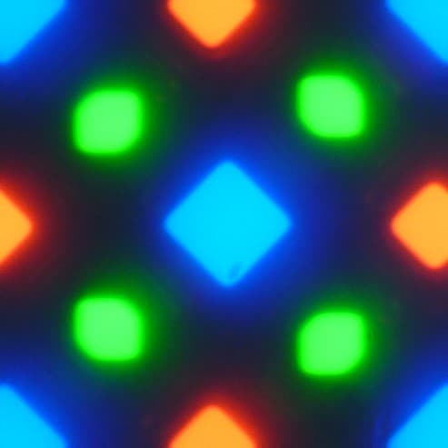 На фрагменте выше можно насчитать 4 зеленых субпикселя, 2 красных (4 половинки) и 2 синих (1 целый и 4 четвертушки), при этом, повторяя эти фрагменты, можно выложить весь экран без разрывов и перехлеста. Для таких матриц компания Samsung ввела наименование PenTile RGBG. Разрешение экрана производитель считает по зеленым субпикселям, по двум другим оно будет ниже. Разумеется, присутствуют некоторая неровность контрастных границ и другие артефакты. Впрочем, из-за высокого разрешения они лишь минимально сказываются на качестве изображения.