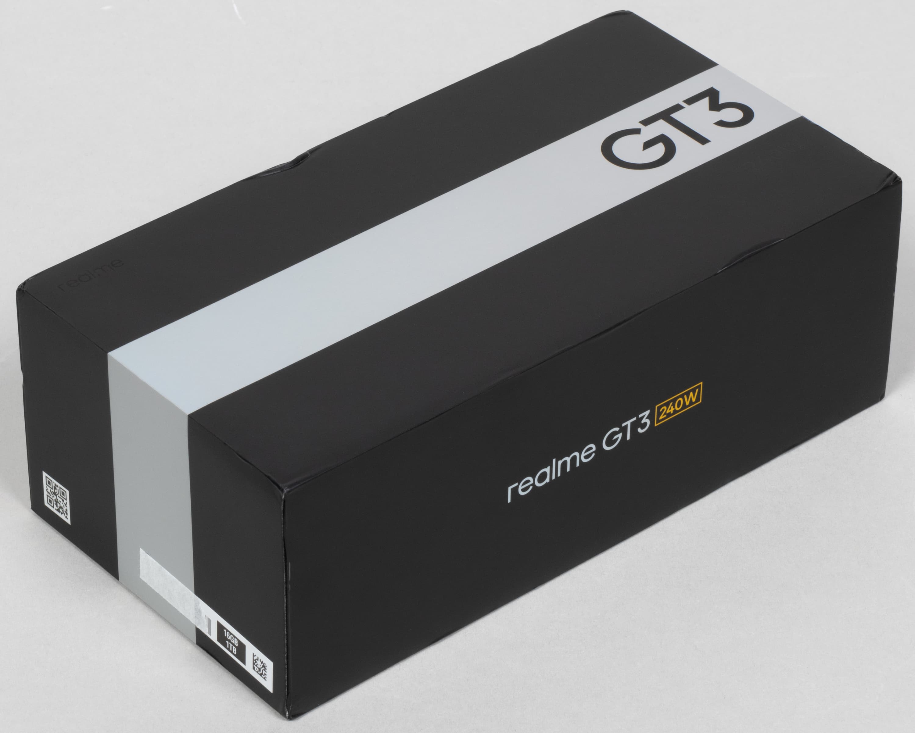 Realme GT3 поставляется в твердой картонной коробке с характерным лаконичным оформлением.