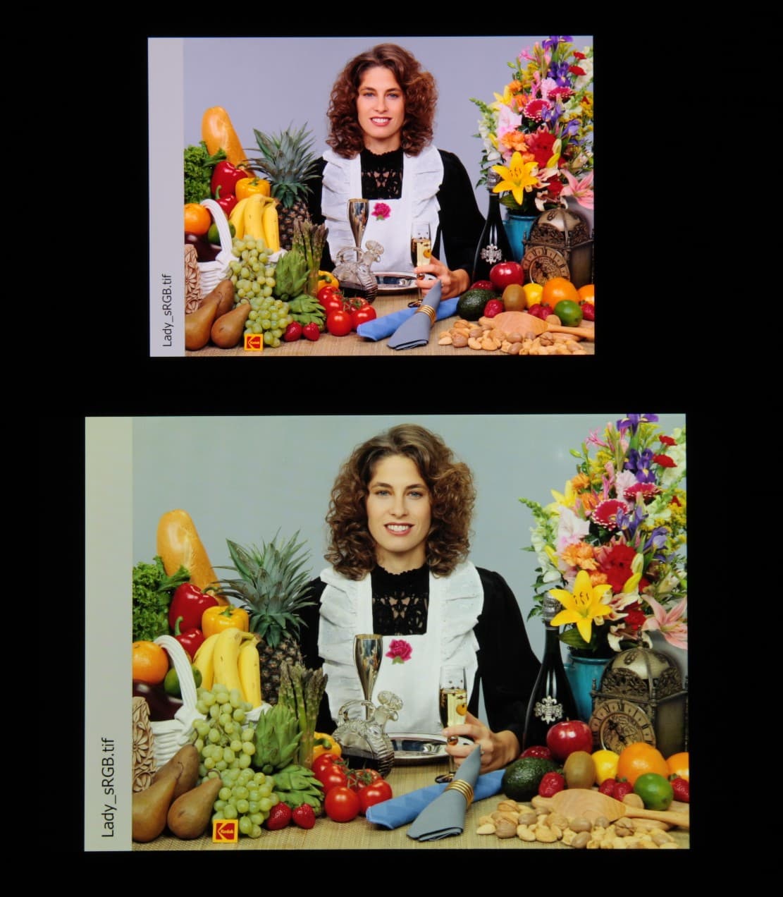 Цветовой охват в режимах Яркие цвета и Кинематографические шире sRGB и практически равен DCI-P3: