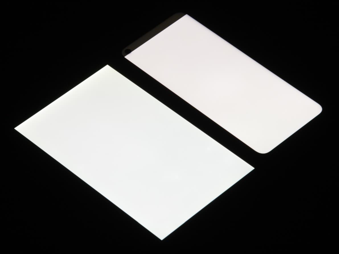 Лицевая поверхность экрана выполнена в виде стеклянной пластины с зеркально-гладкой поверхностью, устойчивой к появлению царапин. Судя по отражению объектов, антибликовые свойства экрана лучше, чем у экрана Google Nexus 7 (2013) (далее просто Nexus 7). Для наглядности приведем фотографию, на которой в выключенных экранах отражается белая поверхность (слева — Nexus 7, справа — Realme Narzo 30 5G, далее их можно различать по размеру):