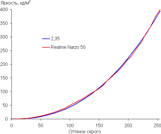 Контрастность (примерно в центре экрана) нормальная — порядка 1000:1. Время отклика при переходе черный-белый-черный равно 14 мс (7 мс вкл. + 7 мс выкл.). Переход между полутонами серого 25% и 75% (по численному значению цвета) и обратно в сумме занимает 23 мс. Построенная по 32 точкам с равным интервалом по численному значению оттенка серого гамма-кривая не выявила завала ни в светах, ни в тенях. Показатель аппроксимирующей степенной функции равен 2,35, что немного выше стандартного значения 2,2. При этом реальная гамма-кривая слегка отклоняется от степенной зависимости: