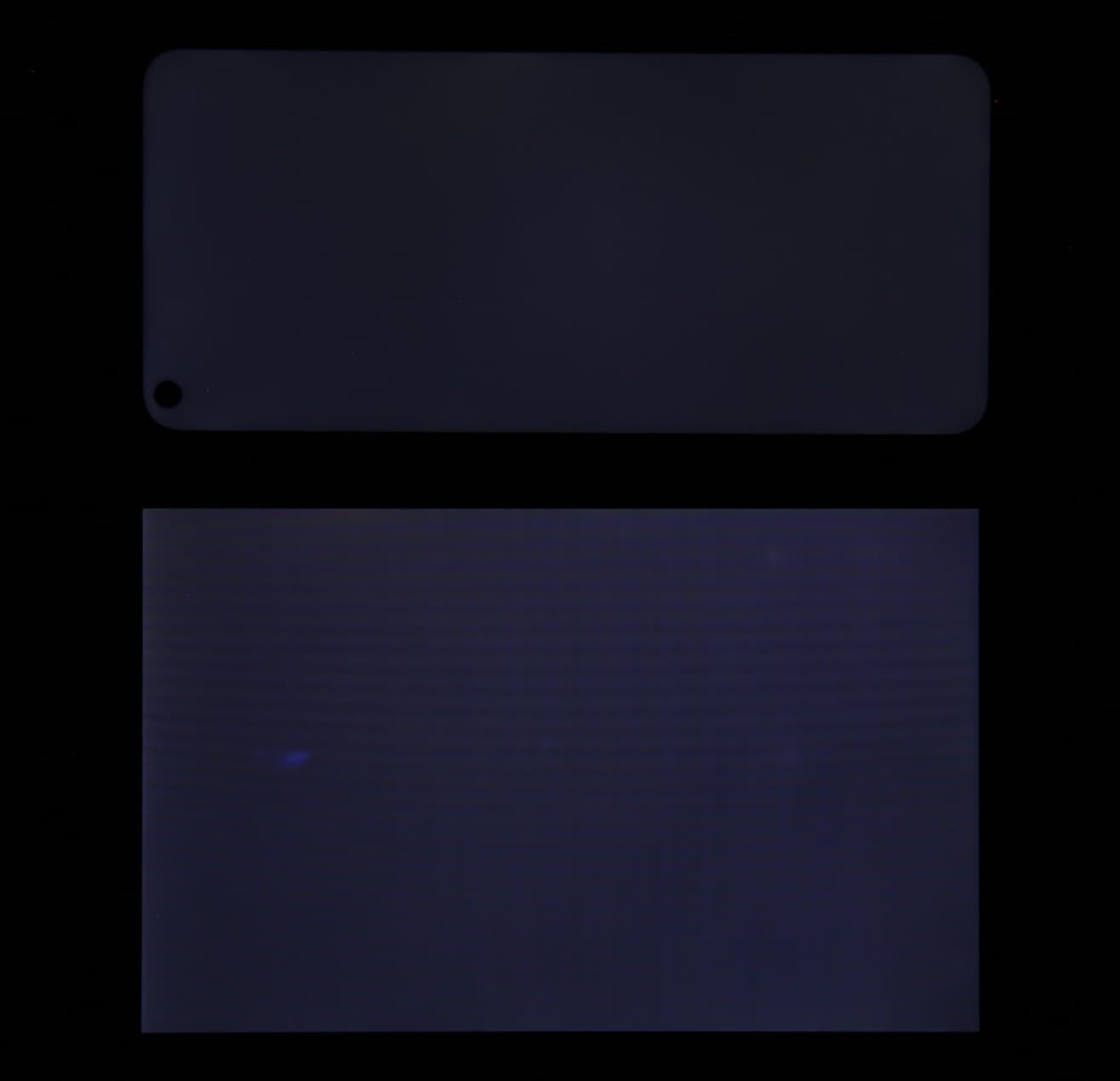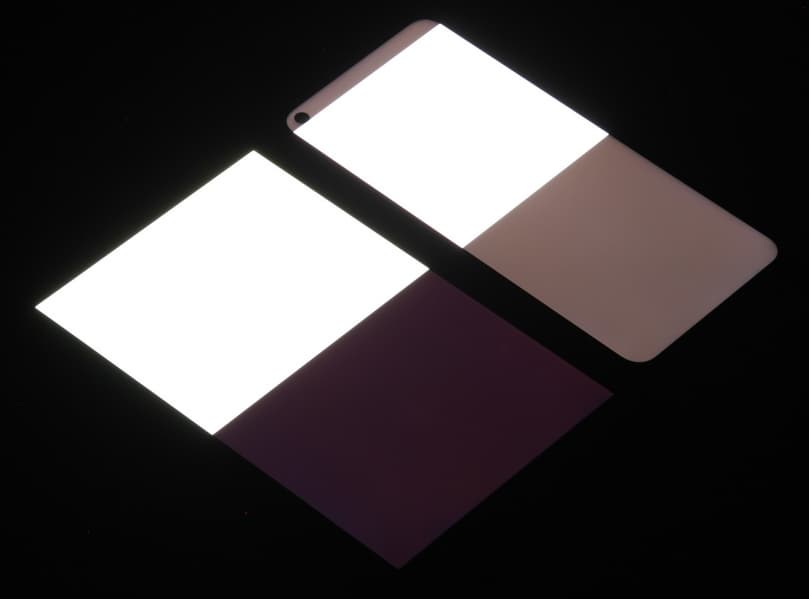 Яркость под углом у экранов уменьшилась (как минимум в 5 раз, исходя из разницы в выдержке), но у смартфона снижение яркости чуть меньше. Черное поле при отклонении по диагонали высветляется сильно, но остается условно нейтрально-серым (так видно глазами). Фотографии ниже это демонстрируют (яркость белых участков в перпендикулярном плоскости экранов направлении одинаковая!):
