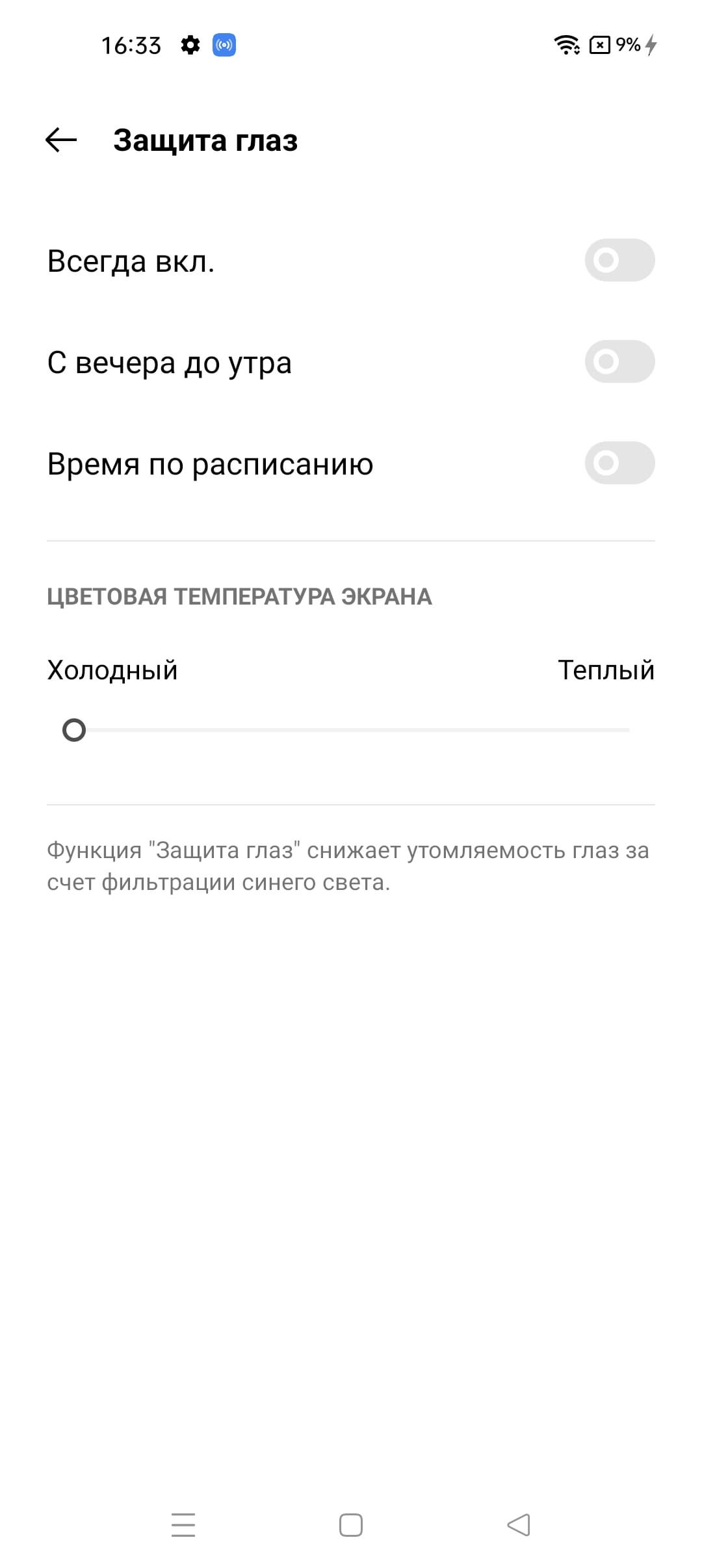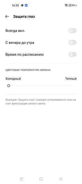 Также присутствует настройка, позволяющая снизить интенсивность синей компоненты (диапазон от 5060 до 4090 К). В принципе, яркий свет может приводить к нарушению суточного (циркадного) ритма, но все решается снижением яркости до низкого, но еще комфортного уровня, а искажать цветовой баланс, уменьшая вклад синего, нет абсолютно никакого смысла.
