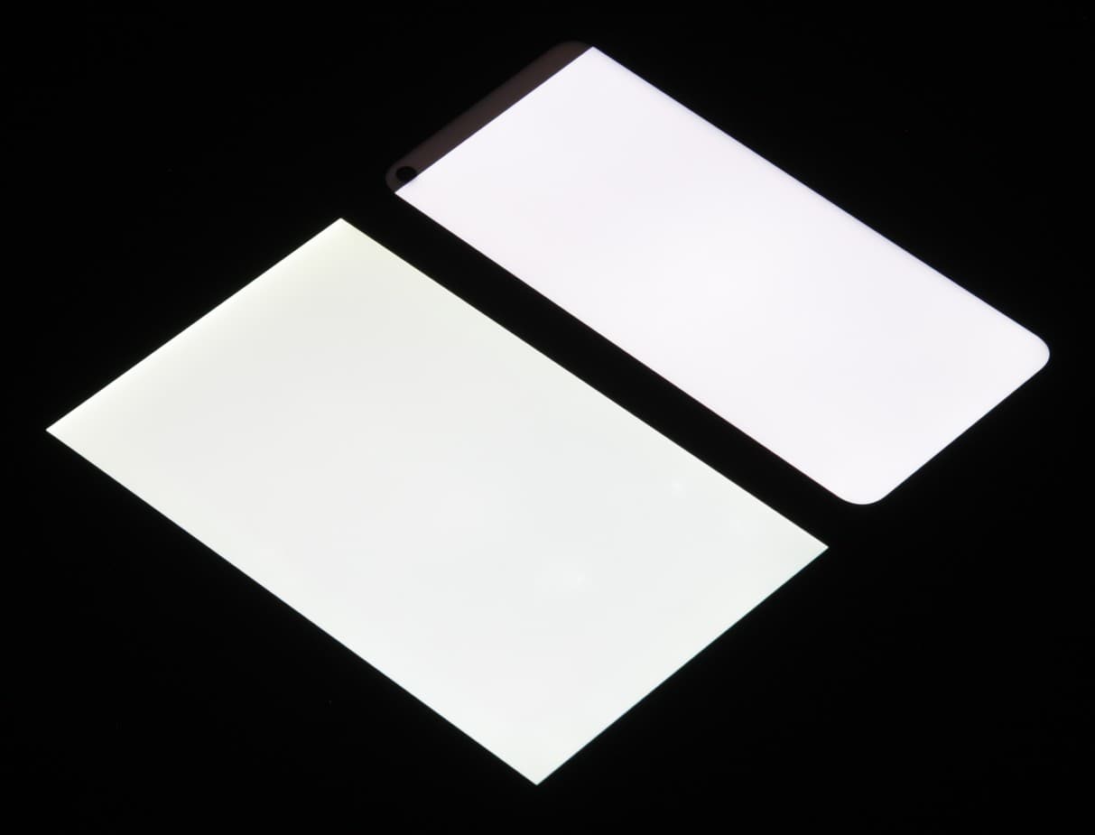 Лицевая поверхность экрана выполнена в виде стеклянной пластины с зеркально-гладкой поверхностью, устойчивой к появлению царапин. Судя по отражению объектов, антибликовые свойства экрана лучше, чем у экрана Google Nexus 7 (2013) (далее просто Nexus 7). Для наглядности приведем фотографию, на которой в выключенных экранах отражается белая поверхность (слева — Nexus 7, справа — Realme Narzo 50, далее их можно различать по размеру):
