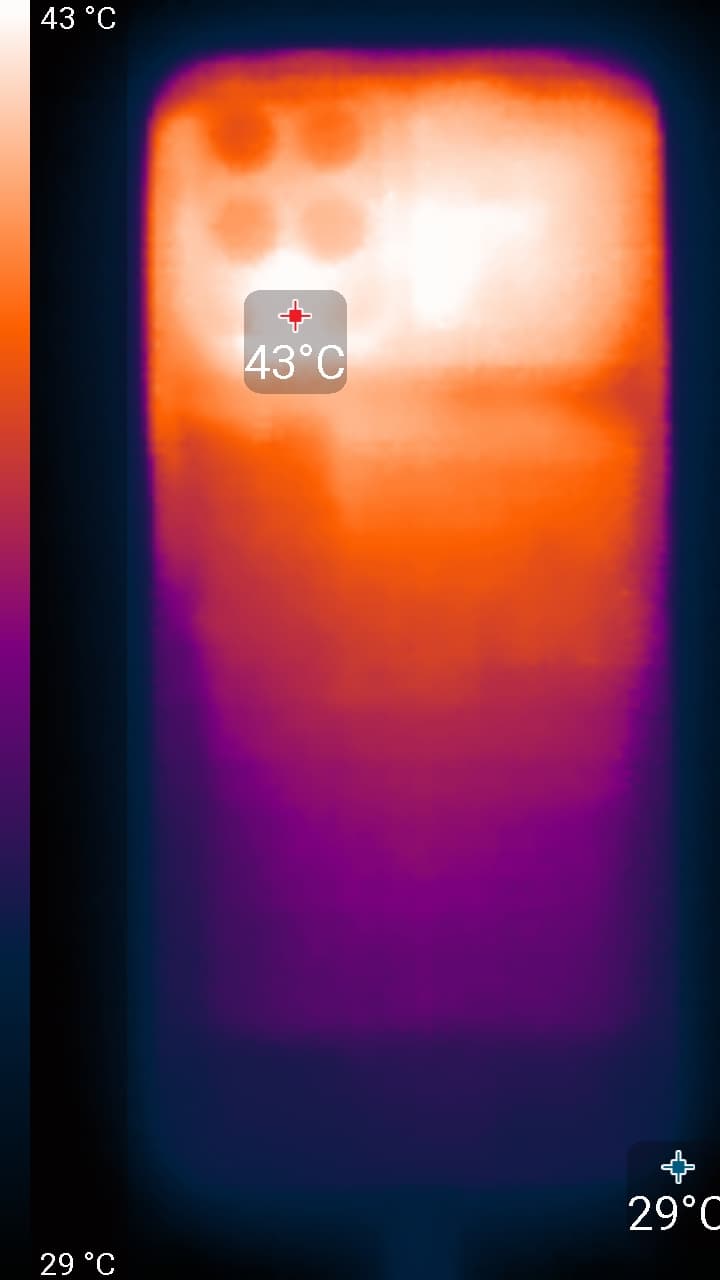Нагрев больше в верхней части аппарата, что, видимо, соответствует расположению микросхемы SoC. По данным теплокамеры, максимальный нагрев составил 43 градуса (при температуре окружающего воздуха в 24 градуса), это несколько выше среднего значения в данном тесте для современных смартфонов.