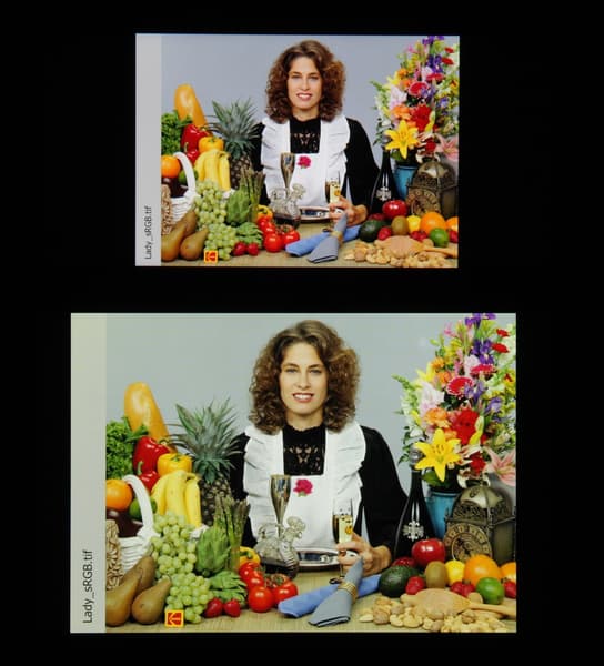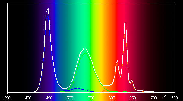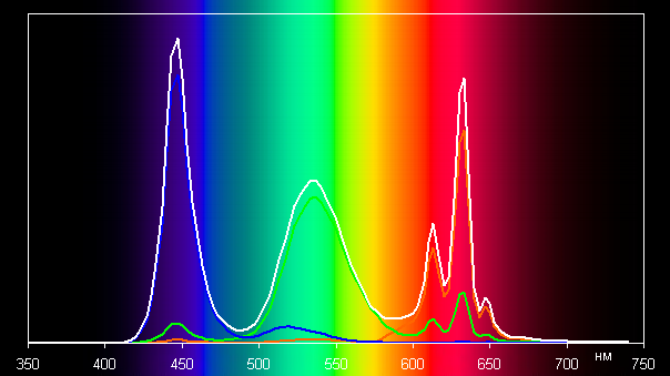 Спектры компонент достаточно хорошо разделены, что и обуславливает широкий цветовой охват. Для потребительского устройства широкий цветовой охват является недостатком, поскольку в итоге цвета изображений — рисунков, фотографий и фильмов, — ориентированных на пространство sRGB (а таких подавляющее большинство), имеют неестественную насыщенность. Особенно это заметно на узнаваемых оттенках, например на оттенках кожи. Результат приведен на фотографиях выше. Впрочем, не все так плохо: при выборе профиля Нежность охват сжимается до границ sRGB.