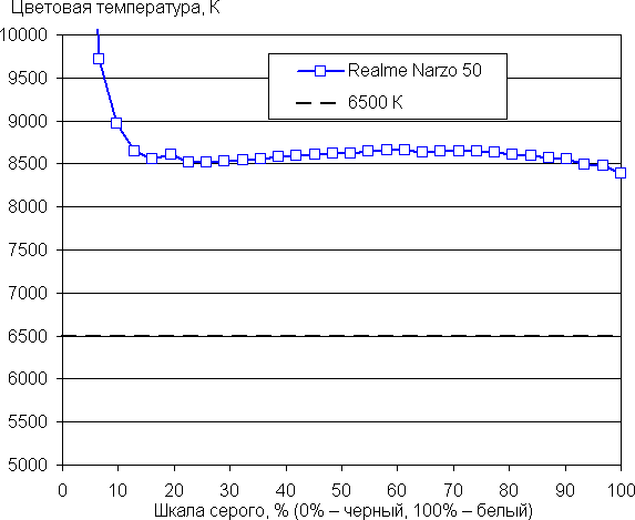 По умолчанию цветовая температура существенно выше стандартных 6500 К. Однако в этом устройстве есть возможность скорректировать цветовой баланс с помощью регулировки оттенка холодный—теплый.