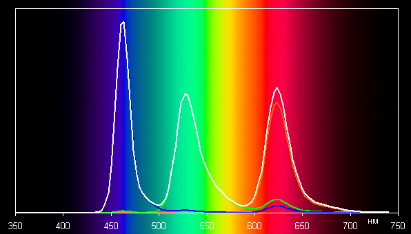 В первом случае спектры компонент (то есть спектры чистых красного, зеленого и синего цветов) очень хорошо разделены: