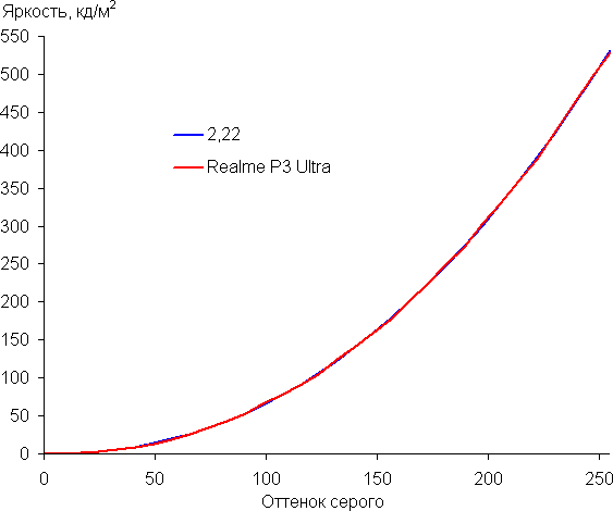 Напомним, что в случае OLED-экранов яркость фрагментов изображения динамично меняется в соответствии с характером выводимого изображения — немного уменьшается для светлых в целом изображений. В итоге полученная зависимость яркости от оттенка (гамма-кривая), скорее всего, не точно соответствует гамма-кривой статичного изображения, так как измерения проводились при последовательном выводе оттенков серого почти на весь экран.