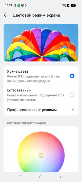 Во всех профилях есть возможность скорректировать цветовой баланс с помощью выбора профиля цветовой температуры или регулировки оттенка на цветовом круге.
