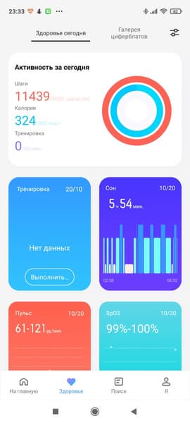 Отметим, что пульс и сон отслеживаются автоматически, а количество кислорода в крови (SpO2) надо измерять вручную.