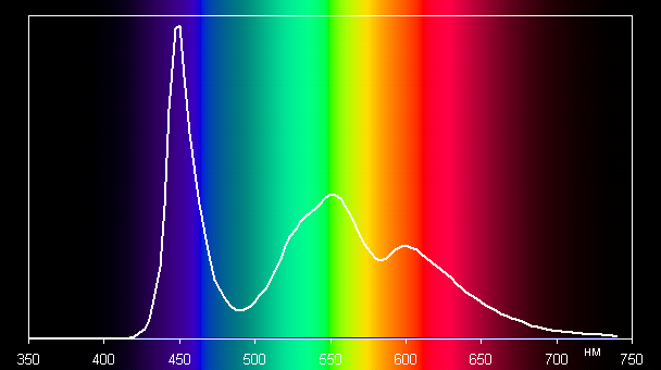 Такой спектр с относительно узким пиком синего и с широкими горбами зеленого и красного цветов характерен для экранов, в которых используется белая светодиодная подсветка с синим излучателем и желтым люминофором.