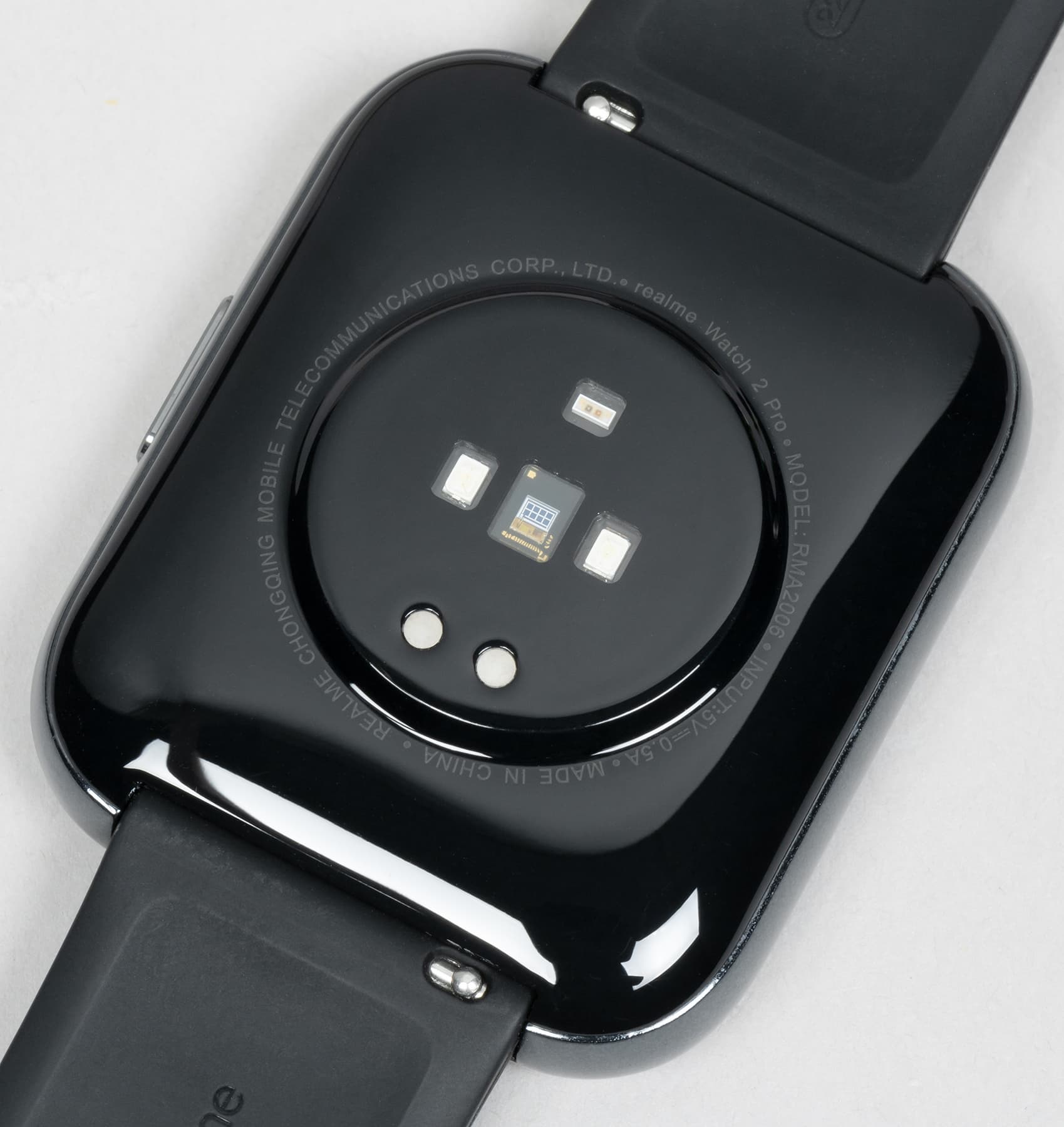 На тыльной стороне расположены контакты для подключения зарядного устройства и датчики — сердечного ритма и количества кислорода в крови. Материал поверхности — пластик, а не металл, что, в общем-то, логично и привычно. Расположение датчиков не изменилось по сравнению с самыми первыми Realme Watch. Ниже на фото — новая модель, а затем — старая.