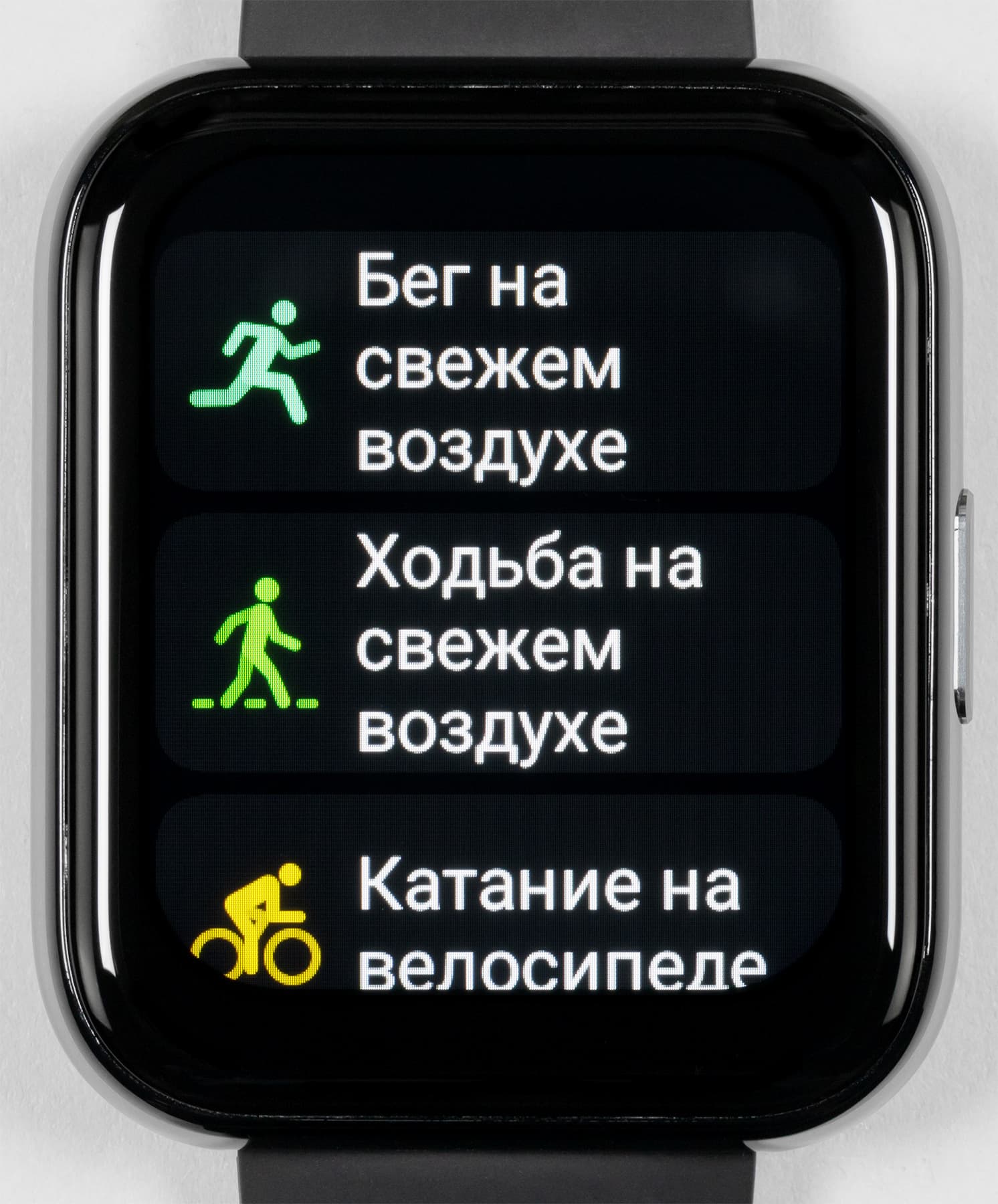 Единственный физический элемент управления — продолговатая кнопка на правой грани. Нажатие на нее включает и выключает циферблат, а также выводит на него с любого внутреннего меню. Поначалу сложно привыкнуть, что кнопка не позволяет попасть в меню приложений — для этого надо сделать свайп снизу. Но постепенно с этим смиряешься.