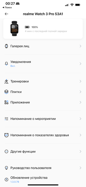 В прошлом году мы отмечали ряд проблем при взаимодействии часов с iPhone. И хотя iOS-приложение всё равно далеко от идеала (в первую очередь это касается корявой русификации), его вполне можно использовать. Главный экран приложения содержит список всех устройств Realme, как текущего, так и прошлых, и вообще никогда не использовавшихся вами. Но нас здесь больше интересует меню внизу и, собственно, плашка нашего устройства. Если нажмем на нее, увидим информацию о модели и настройки.