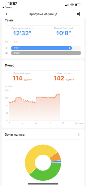 Если же всё сделать как надо, то получим более полную картину. Ниже — результат пешей прогулки. Но отметим одну странность: скорость указывается не в км/ч, а в минутах за километр. В данном случае часы показывают, что 1 км мы проходили в среднем за 12 минут 32 секунды. Исходя из этого легко рассчитать, что скорость была примерно 4,78 км/ч. Но почему само приложение не может выполнить эту простую арифметику?
