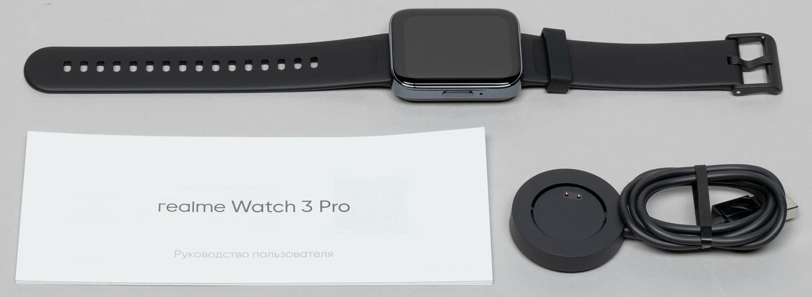 Комплектация крайне скромна и аналогична предшественникам: помимо самих часов — только краткое руководство пользователя (на русском языке) и зарядное устройство в виде платформы, на которую сверху кладутся часы. USB-кабель у зарядки неотсоединяемый.