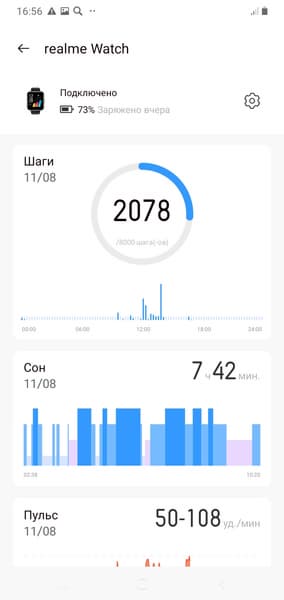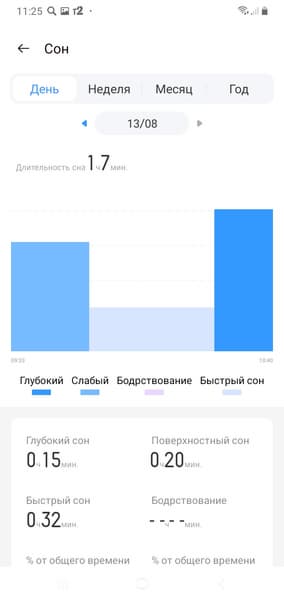 Кстати, в отношении сна мы заметили странную особенность часов. Если вы, проспав ночь, встав утром и позавтракав, решите еще вздремнуть, то часы зафиксируют только этот второй сон, даже если он будет около часа. С одной стороны, это здорово, что часы в принципе корректно (даже днем) могут определять краткосрочный сон. С другой — данные за предыдущий сон, если он был не в прошлые сутки, видимо, просто перезаписываются, и найти их невозможно. На скриншотах ниже — тот самый утренний сон. Если нажать на стрелочку влево, которая находится рядом с датой 13/08 — попадем на предыдущую дату, где уже сон за прошлую ночь, а не за эту.