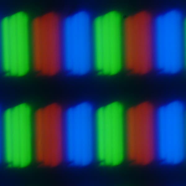 На уровне яркости ниже максимального есть модуляция подсветки, но ее частота очень высокая — порядка 10 кГц, поэтому мерцания не видно. Микрофотографии демонстрирую типичную для IPS структуру субпикселей.