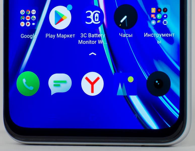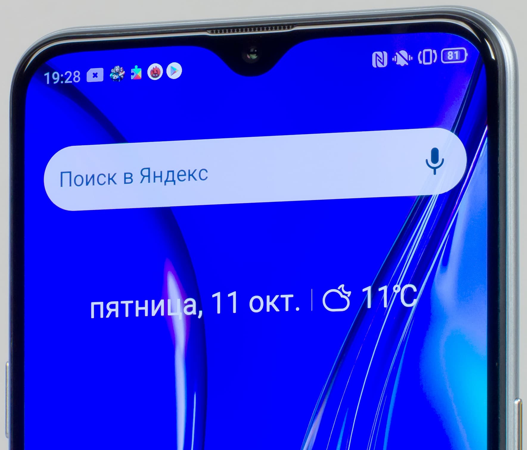 Фронтальная камера привычно упрятана в вырез в экране, это современный каплевидный вырез, а не широкая «челка». Впрочем, вырез все равно получился довольно широким, хотя модуль камеры там один.