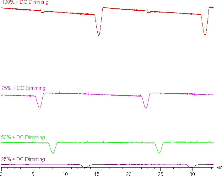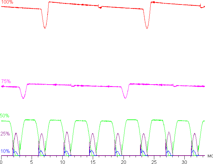 На любом уровне яркости присутствует значимая модуляция с частотой 60 или 240 Гц. На рисунке ниже приведены зависимости яркости (вертикальная ось) от времени (горизонтальная ось) для нескольких значений настройки яркости: