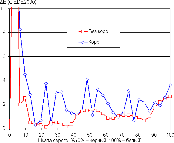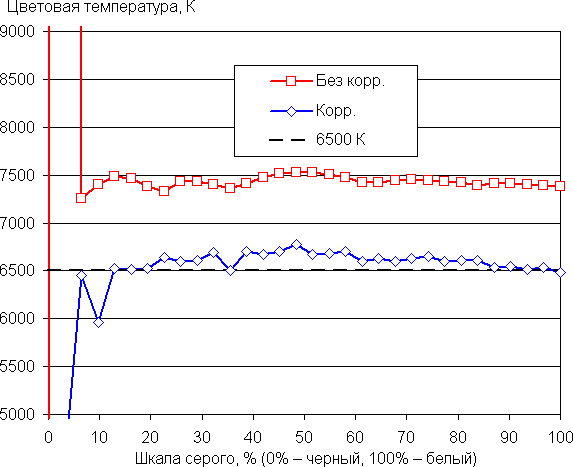 После сдвига ползунка почти в крайнее правое положение баланс оттенков на шкале серого хороший, поскольку цветовая температура близка к стандартным 6500 К, а отклонение от спектра абсолютно черного тела (ΔE) ниже 10, что для потребительского устройства считается приемлемым показателем. При этом цветовая температура и ΔE мало изменяются от оттенка к оттенку — это положительно сказывается на визуальной оценке цветового баланса. Впрочем, даже по умолчанию цветовая температура выше, но не критично, а разброс ΔE также невысок. Поэтому выполнять коррекцию особого смысла нет. (Самые темные области шкалы серого можно не учитывать, так как там баланс цветов не имеет большого значения, да и погрешность измерений цветовых характеристик на низкой яркости большая.)