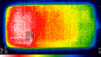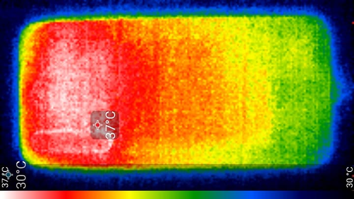 Нагрев больше в верхней части аппарата, что, видимо, соответствует расположению микросхемы SoC. По данным теплокамеры, максимальный нагрев составил 37 градусов (при температуре окружающего воздуха в 24 градуса), это не очень много.