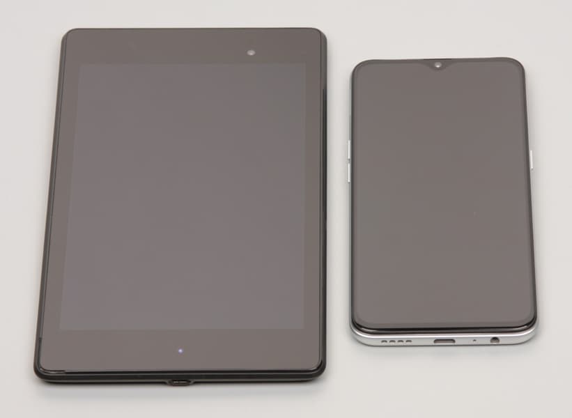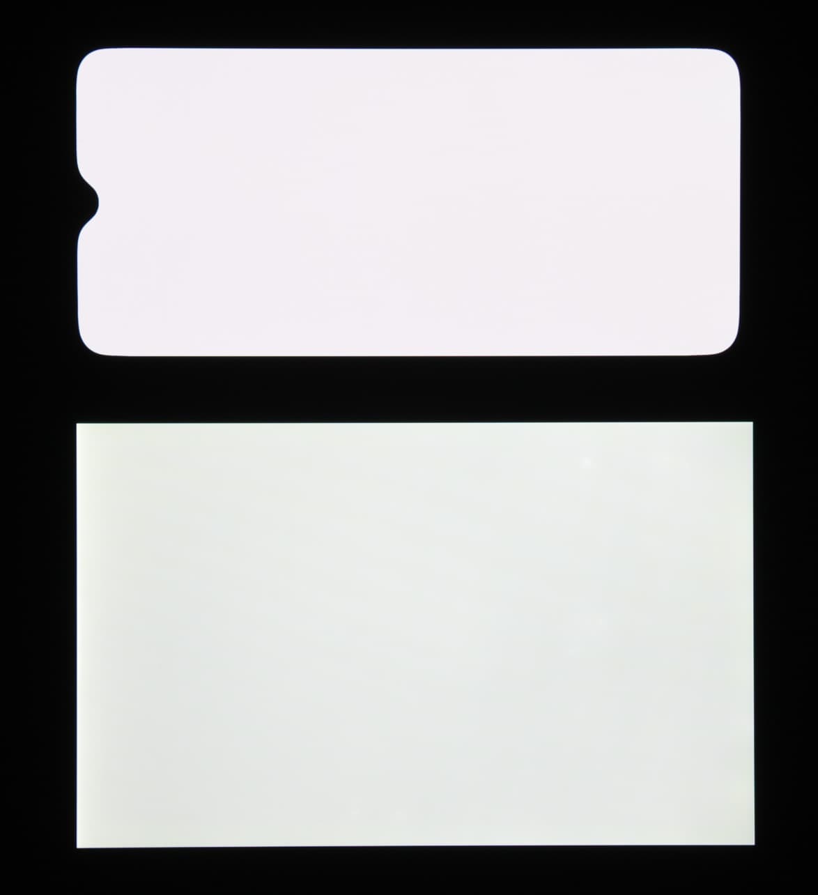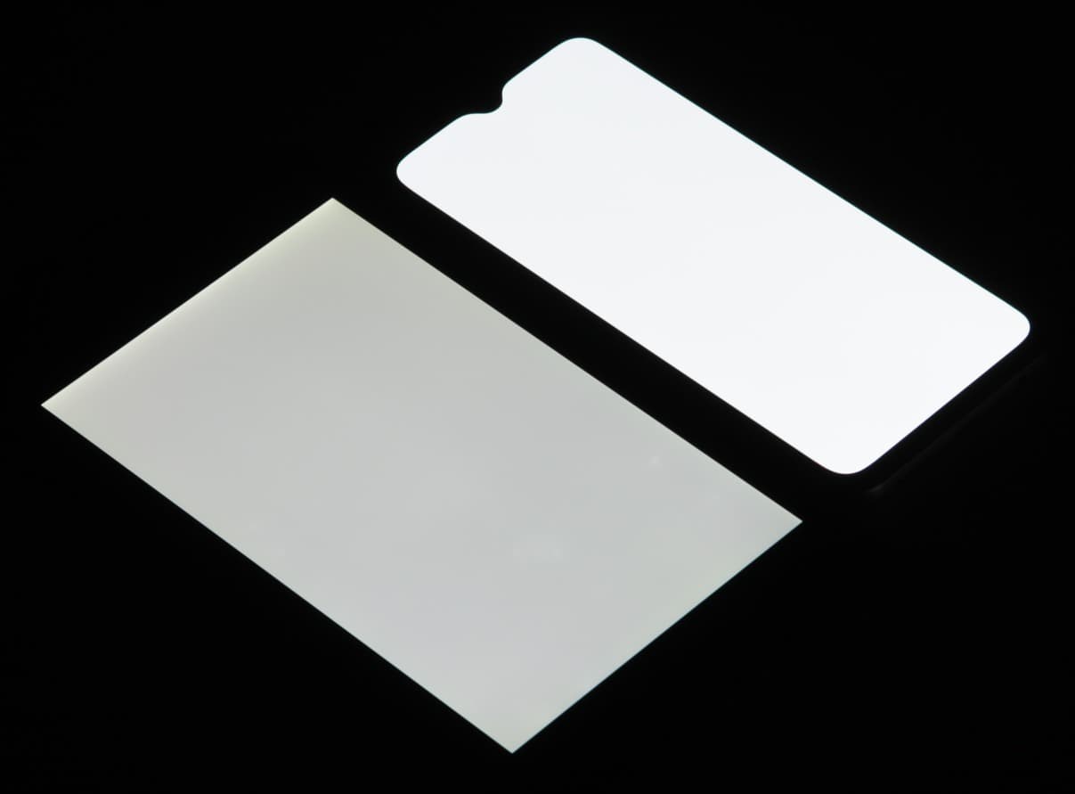 Лицевая поверхность экрана выполнена в виде стеклянной пластины с зеркально-гладкой поверхностью, устойчивой к появлению царапин. Судя по отражению объектов, антибликовые свойства экрана чуть лучше, чем у экрана Google Nexus 7 (2013) (далее просто Nexus 7). Для наглядности приведем фотографию, на которой в выключенных экранах отражается белая поверхность (слева — Nexus 7, справа — Realme XT, далее их можно различать по соотношению сторон экрана):