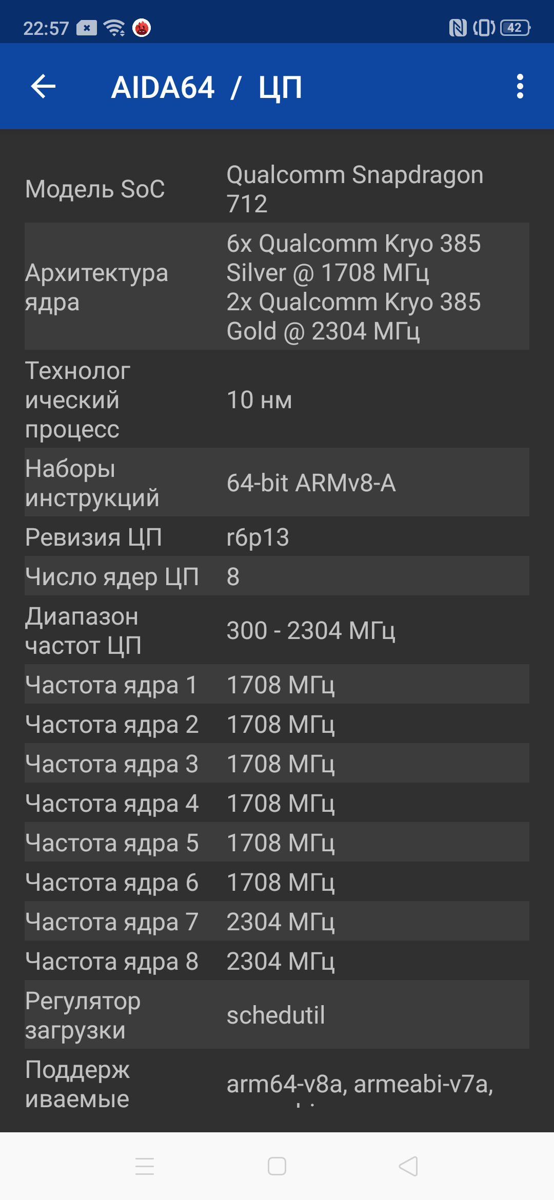 - SoC Qualcomm Snapdragon 712, 8 ядер (2×Kryo 360 Gold @2,3 ГГц + 6×Kryo 360 Silver @1,7 ГГц)