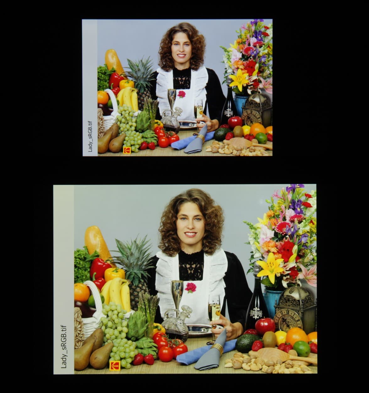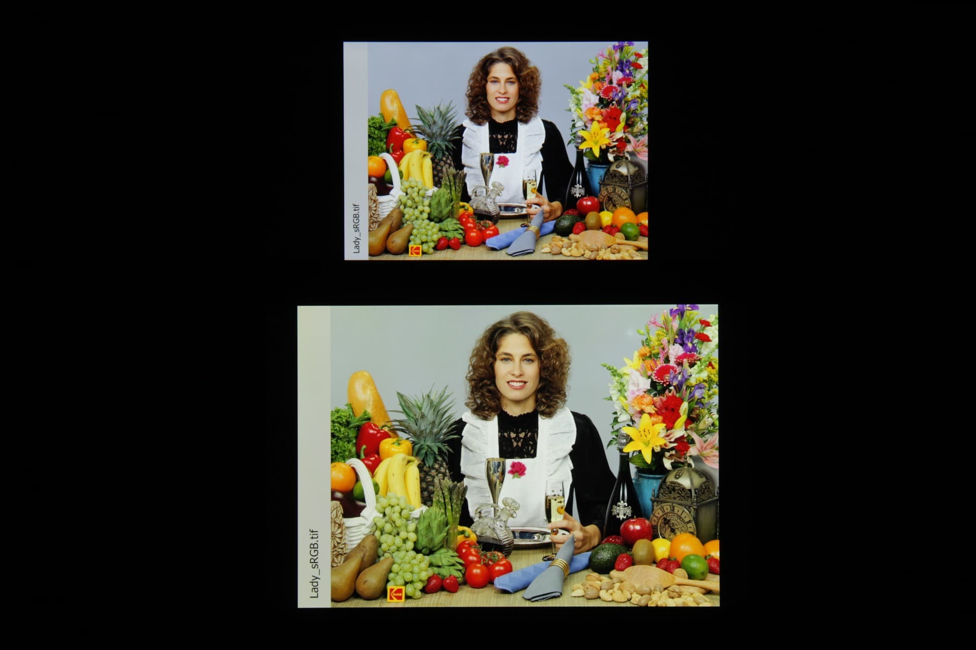 Контрастность (примерно в центре экрана) высокая — порядка 1250:1. Время отклика при переходе черный-белый-черный равно 20 мс (10 мс вкл. + 10 мс выкл.). Переход между полутонами серого 25% и 75% (по численному значению цвета) и обратно в сумме занимает 34 мс. Построенная по 32 точкам с равным интервалом по численному значению оттенка серого гамма-кривая не выявила завала ни в светах, ни в тенях. Показатель аппроксимирующей степенной функции равен 2,24, что немного выше стандартного значения 2,2. При этом реальная гамма-кривая мало отклоняется от степенной зависимости: