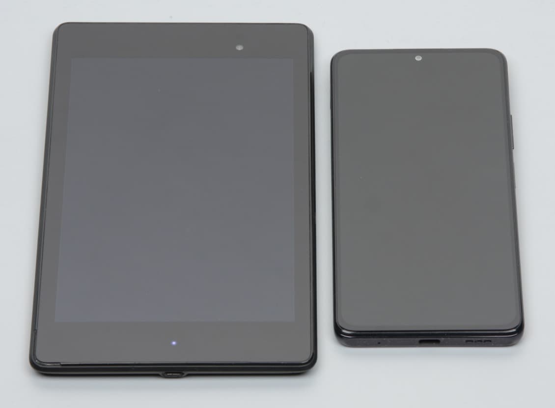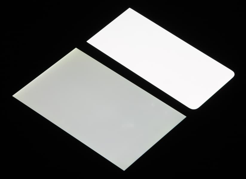 Лицевая поверхность экрана выполнена в виде стеклянной пластины с зеркально-гладкой поверхностью, устойчивой к появлению царапин. Судя по отражению объектов, антибликовые свойства экрана не хуже, чем у экрана Google Nexus 7 (2013) (далее просто Nexus 7). Для наглядности приведем фотографию, на которой в выключенных экранах отражается белая поверхность (слева — Nexus 7, справа — Redmi Note 10 Pro, далее их можно различать по размеру):