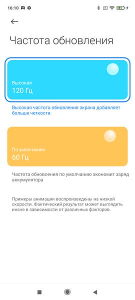 В настройках экрана можно включить режим с повышенной до 120 Гц частотой обновления: