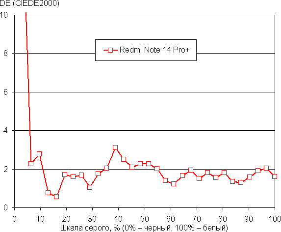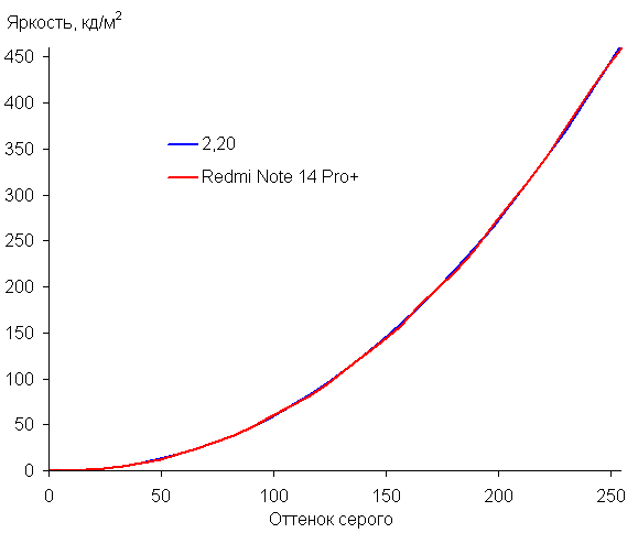 Напомним, что в случае OLED-экранов яркость фрагментов изображения динамично меняется в соответствии с характером выводимого изображения — немного уменьшается для светлых в целом изображений. В итоге полученная зависимость яркости от оттенка (гамма-кривая), скорее всего, не соответствует гамма-кривой статичного изображения, так как измерения проводились при последовательном выводе оттенков серого почти на весь экран.