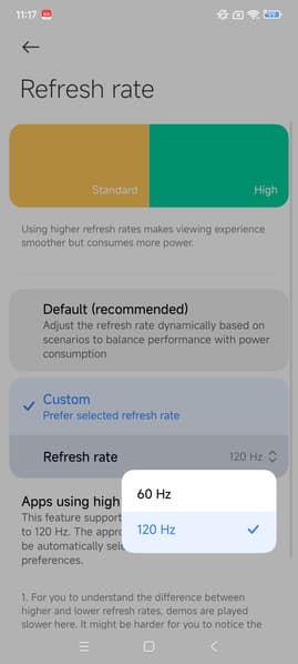 В настройках экрана можно включить режим с повышенной до 120 Гц частотой обновления:
