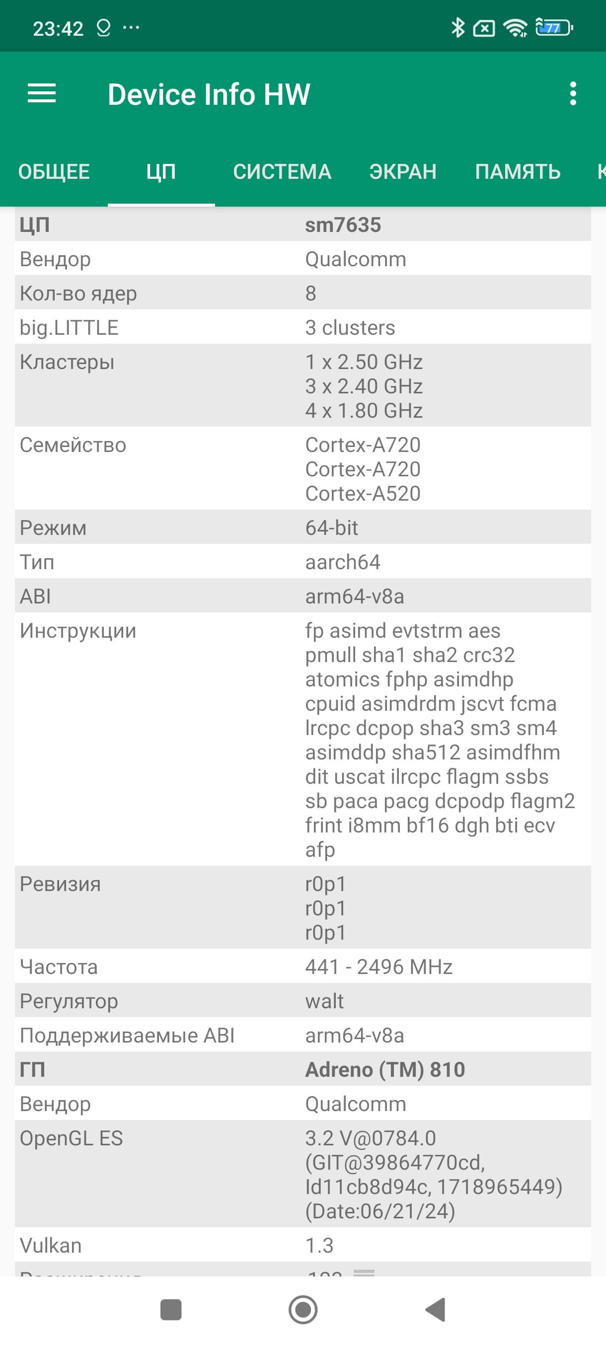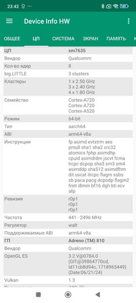 - SoC Qualcomm SM7635 Snapdragon 7s Gen3, 8 процессорных ядер (1×Cortex-A720 @2,5 ГГц + 3×Cortex-A720 @2,4 ГГц + 4×Cortex-A520 @1,8 ГГц)