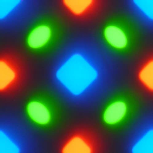 На фрагменте выше можно насчитать 4 зеленых субпикселя, 2 красных (4 половинки) и 2 синих (1 целый и 4 четвертушки), при этом, повторяя эти фрагменты, можно выложить весь экран без разрывов и перехлеста. Для таких матриц компания Samsung ввела наименование PenTile RGBG. Разрешение экрана производитель считает по зеленым субпикселям, по двум другим оно будет ниже. Разумеется, присутствуют некоторая неровность контрастных границ и другие артефакты. Впрочем, из-за очень высокого разрешения они лишь минимально сказываются на качестве изображения.