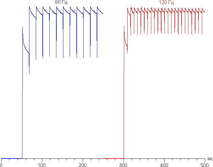 Переключение состояния элементов матрицы выполняется практически мгновенно, но на фронте включения может присутствовать ступенька шириной примерно 17 мс (что соответствует частоте обновления экрана примерно в 60 Гц) или примерно 8 мс (120 Гц). Например, так выглядят зависимости яркости от времени при переходе от черного к белому: