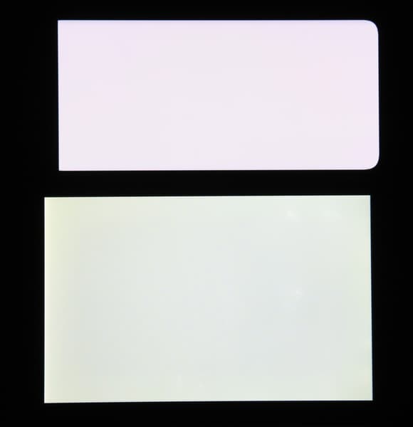 Экран характеризуется великолепными углами обзора. Яркость под углом у двух экранов (если сравнивать еще и с Nexus 7) уменьшается, но в случае смартфона падение яркости выражено гораздо меньше. В итоге, даже если установить формально одинаковую яркость, экран этого смартфона визуально выглядит гораздо более ярким (в сравнении с ЖК-экранами), так как на экран мобильного устройства часто приходится смотреть как минимум под небольшим углом. Правда, белый цвет при отклонении на большие углы приобретает легкий сине-зеленый оттенок. Черный цвет у смартфона остается просто черным под любыми углами. Он настолько черный, что параметр контрастности в данном случае неприменим. Для сравнения приведем фотографии, на которых на экран смартфона и экран второго участника (Nexus 7; снизу — Nexus 7, сверху — смартфон) выведены одинаковые изображения, при этом яркость экранов изначально установлена примерно на 200 кд/м², а цветовой баланс на фотоаппарате принудительно переключен на 6500 К.