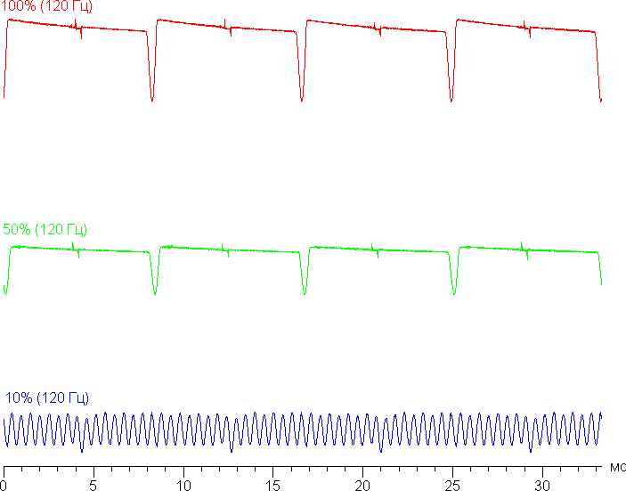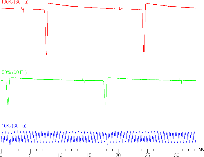 На высоком и среднем уровне яркости присутствует значимая модуляция с частотой 60 или 120 Гц. На рисунке ниже приведены зависимости яркости (вертикальная ось) от времени (горизонтальная ось) для нескольких значений настройки яркости. Сначала для режима с частотой обновления 60 Гц: